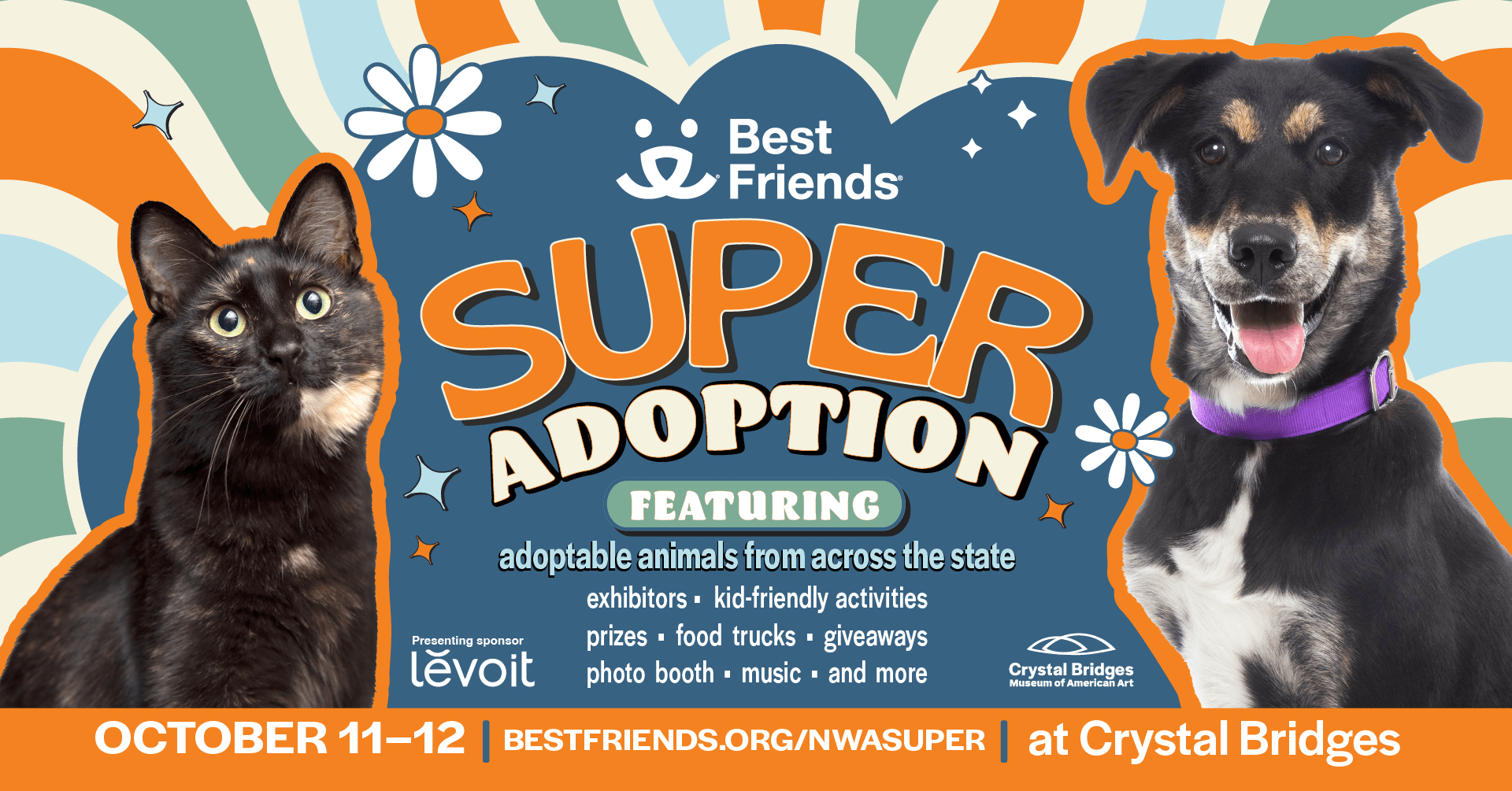 This year’s Super Adoption will take place on the beautiful grounds of Crystal Bridges Museum of American Art, and will feature vendors, interactive activities, music, giveaways, prizes, food, and of course, adorable adoptable pets.