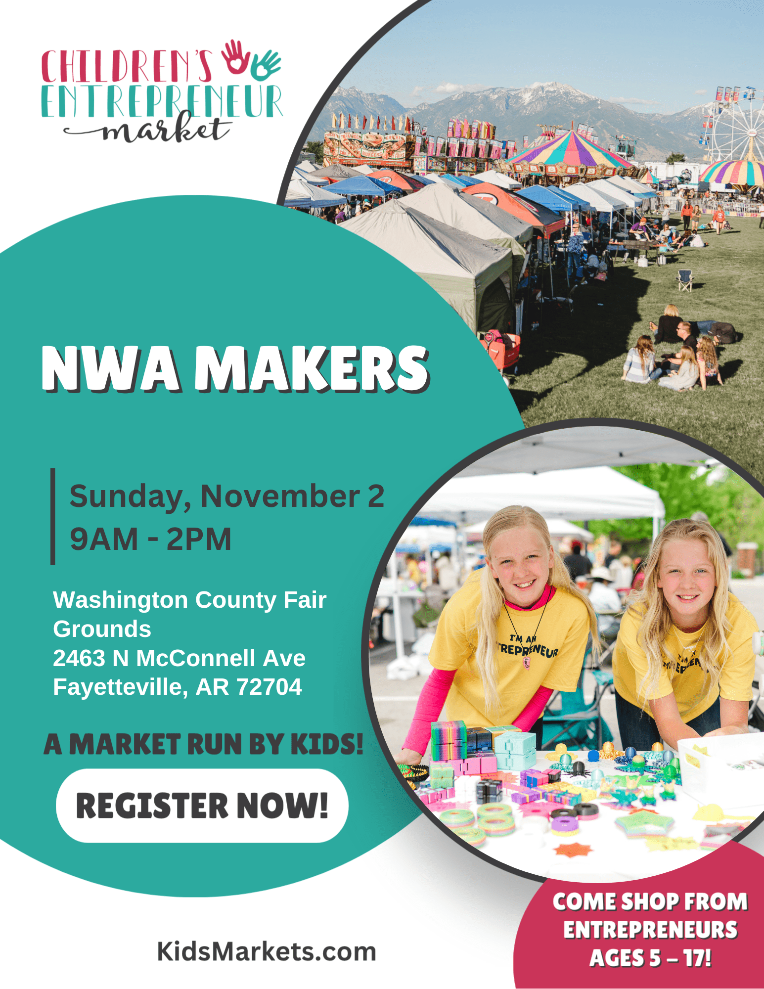 The Children’s Entrepreneur Market is thrilled to be back with NWA Makers for the Big Fall Event! Local kids will join artists, makers, and craftsmen from across Northwest Arkansas to showcase their amazing products and creativity. This market will be at Washington County Fairgrounds in Fayetteville on Sunday November 2nd, kid vendors will be there from 9AM-2PM.